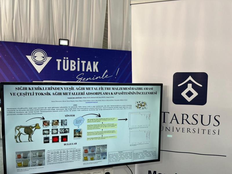 Mersin Tarsus OSB Teknik Bilimler Meslek Yüksekokulu Kimya Teknolojisi Bölümü Öğrencileri Yasemin Sude Akdöner ve Melisa Ayata, öğretim üyesi Doç. Dr. Fatma Ulusal danışmanlığında hazırladıkları “Sığır Kemiklerinden Yeşil Ağır Metal Filtre Malzemesi Hazırlaması ve Çeşitli Toksik Ağır Metalleri Adsorplama Kapasitesinin İncelenmesi” başlıklı projeleriyle finalde birincilik elde etti. Çalışmaya ayrıca Bölümümüzde misafir öğretim elemanı olarak bulunan Dr.İlyas Gönül ve Berivan SADI'nın da destek verdi.