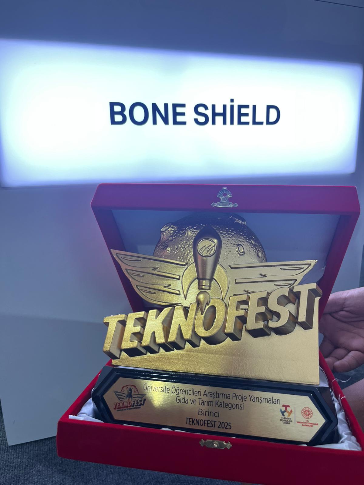 TÜBİTAK tarafından düzenlenen “2242 Üniversite Öğrencileri Araştırma Proje Yarışmaları”nın "Gıda ve Tarım" kategorisinde “Bone Shield” takımı olarak yarışan öğrenciler, TEKNOFEST 2025 kapsamında düzenlenen törende ödüllerini Sayın Cumhurbaşkanı Recep Tayyip Erdoğan’dan aldı.